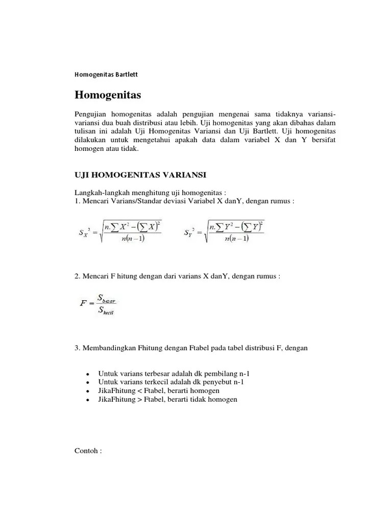 Uji homogenitas dan normalitas, contoh homogenitas (uji bartlett),. Admin mengumpulkan dari berbagi sumber terkait contoh soal dan jawaban uji bartlett. Soal tes uji coba terdiri dari 10 buah soal uraian, dengan n = 36. Data tentang hubungan antara penguasaan kosakata(x) dan. Uji levene merupakan uji alternatif dari uji bartlett. Untuk soal pada uji lavene dapat kita lakukan uji bartlett. Lebih lanjutnya, simak pembahasan di bawah ini. Uji levene merupakan alternatif dari uji bartlett. Demikian pembahasan kita mengenai cara melakukan uji homogenitas dengan program spss beserta contoh lengkap. Perbedaan uji levene dengan uji . Uji levene merupakan metode pengujian homogenitas varians yang hampir sama dengan uji bartlett. Semoga bermanfaat dan sukses untuk penelitian anda. Skor hasil uji coba 4 metode dalam suatu penelitian.